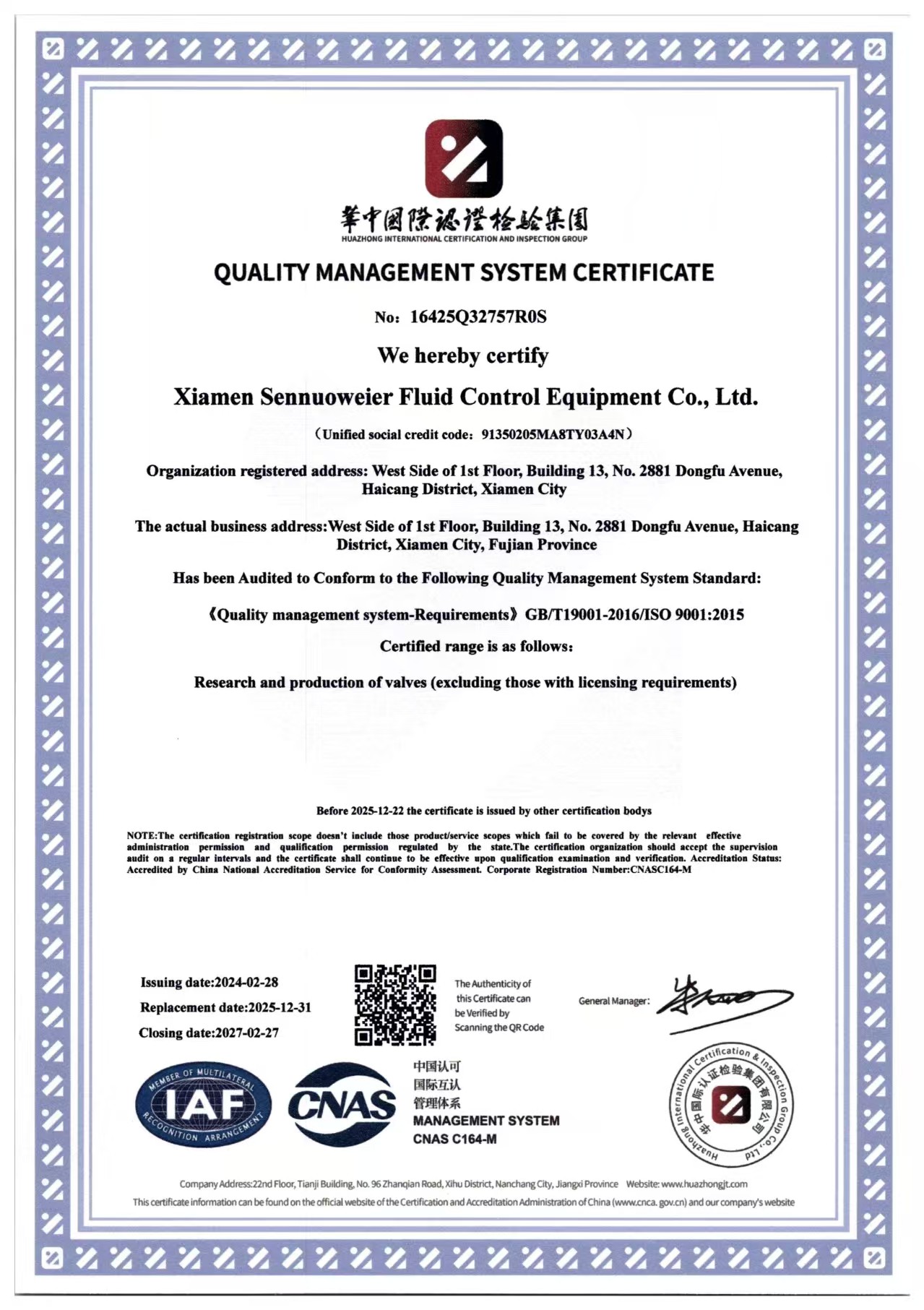 质量管理体系认证证书